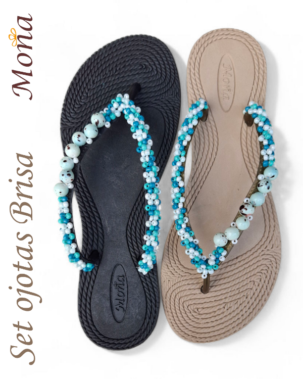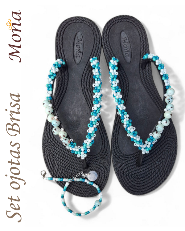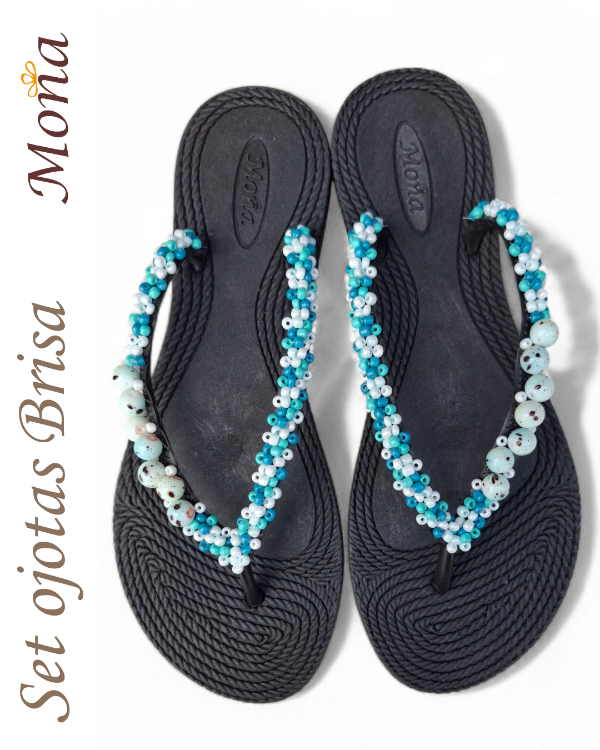 Ojotas bordadas artesanalmente en mostacillas y pedrería. En ese caso, se combina pedrería con mostacillas con tonos turquesas, celestes y blancos. Incluye tobillera a tono, con cadena regulable. En la sección Información podés consultar la guía de talles, o solicitarla por WhatsApp