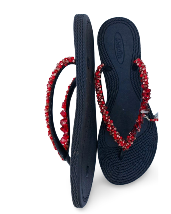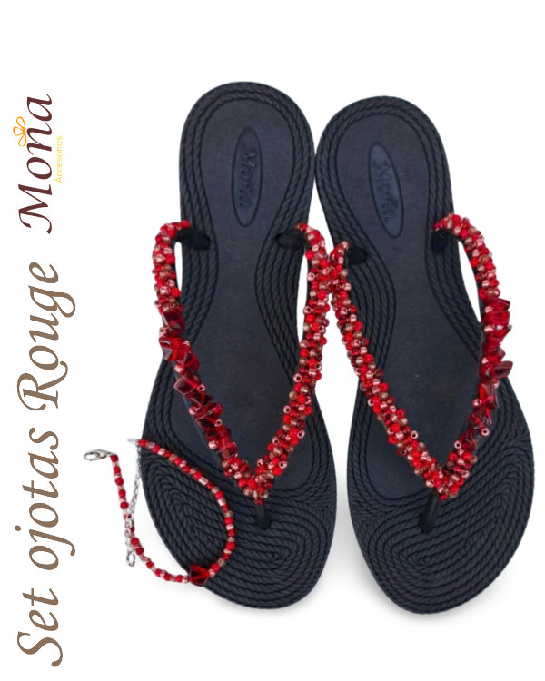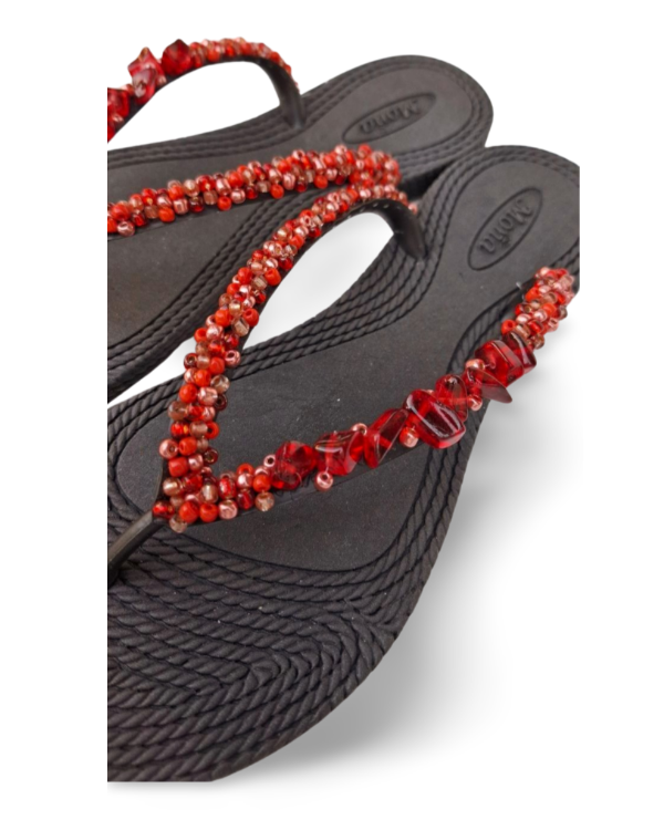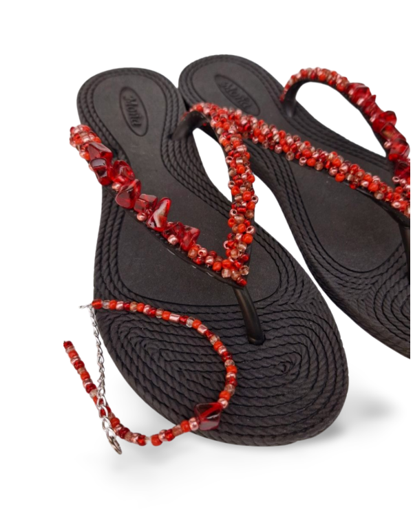 Ojotas bordadas artesanalmente en mostacillas y pedrería. En ese caso, se combina pedrería con mostacillas con tonos cobrizos y rojos. Incluye tobillera a tono, con cadena regulable. En la sección Información podés consultar la guía de talles, o solicitarla por WhatsApp