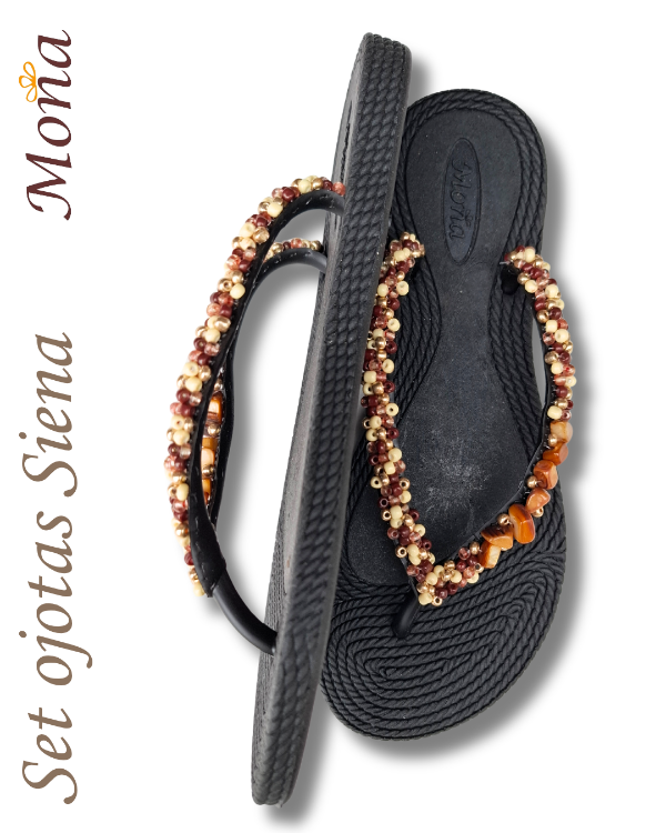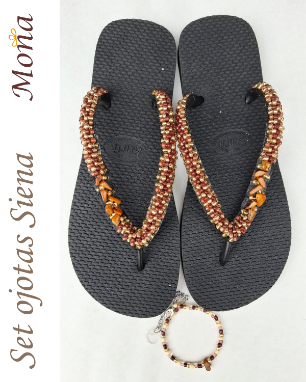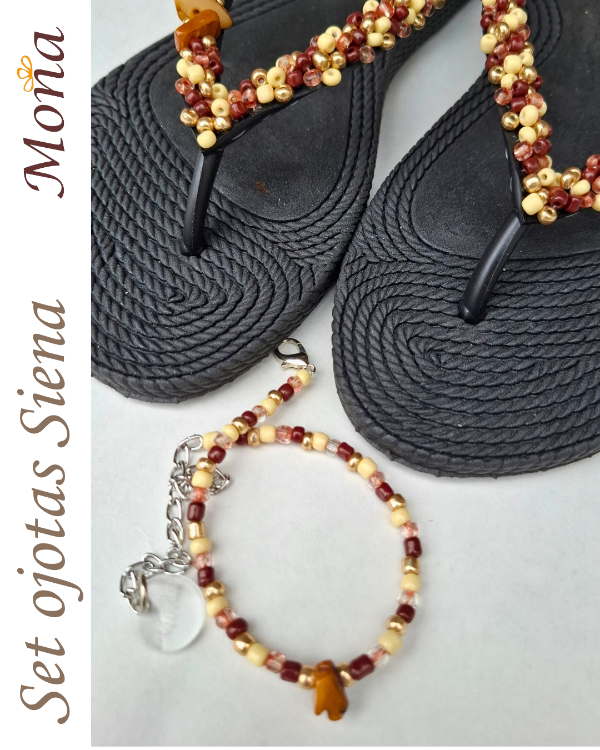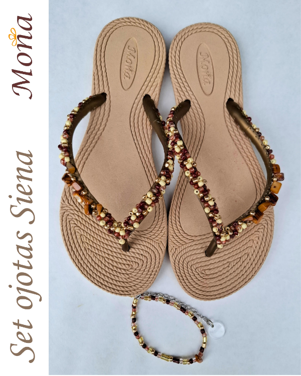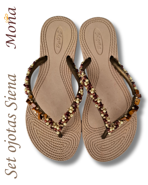 Ojotas bordadas artesanalmente en mostacillas y pedrería. En ese caso, se combina pedrería con mostacillas con tonos marrones y detalles de nácar.Opcional tobillera a tono, con cadena regulable. En la sección Información podés consultar la guía de talles, o solicitarla por WhatsApp