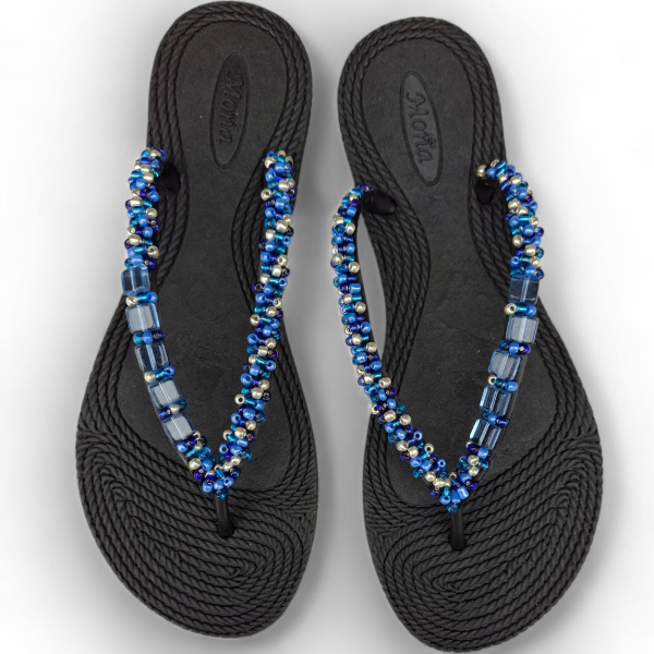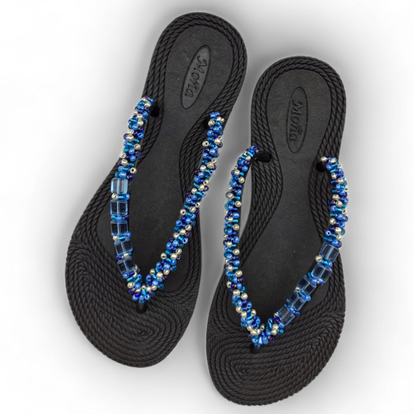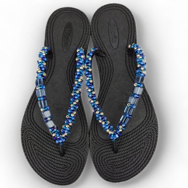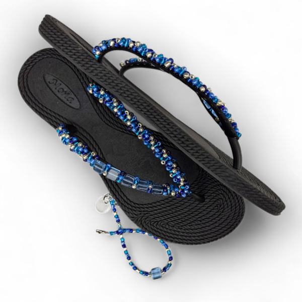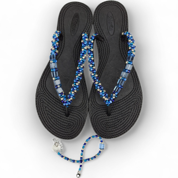 Ojotas bordadas artesanalmente en mostacillas y pedrería. En ese caso, se combinan los colores azules, celestes y plata con detalles de perlas a tono. Incluye tobillera a tono, con cadena regulable. En la sección Información podés consultar la guía de talles, o solicitarla por WhatsApp