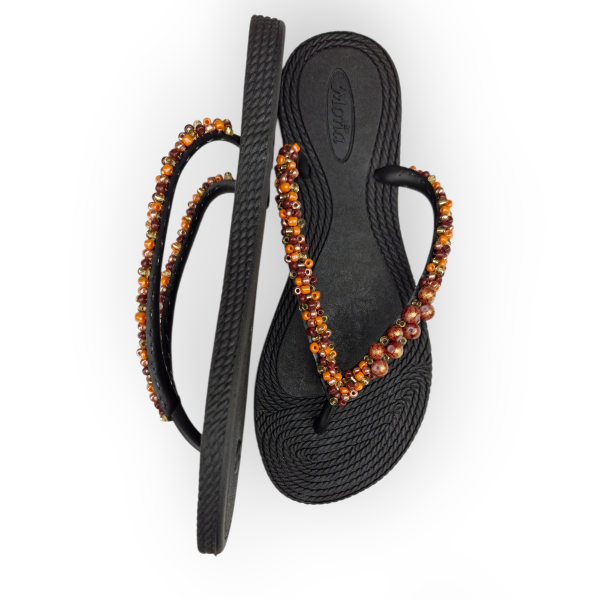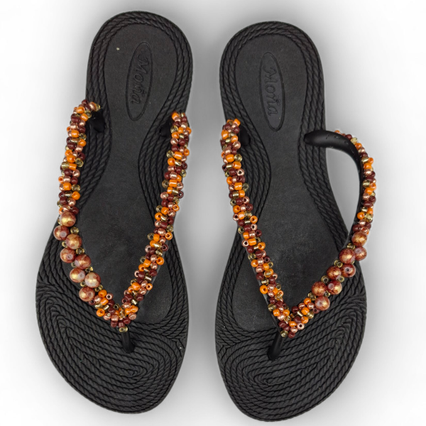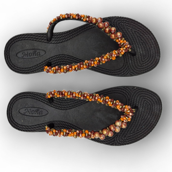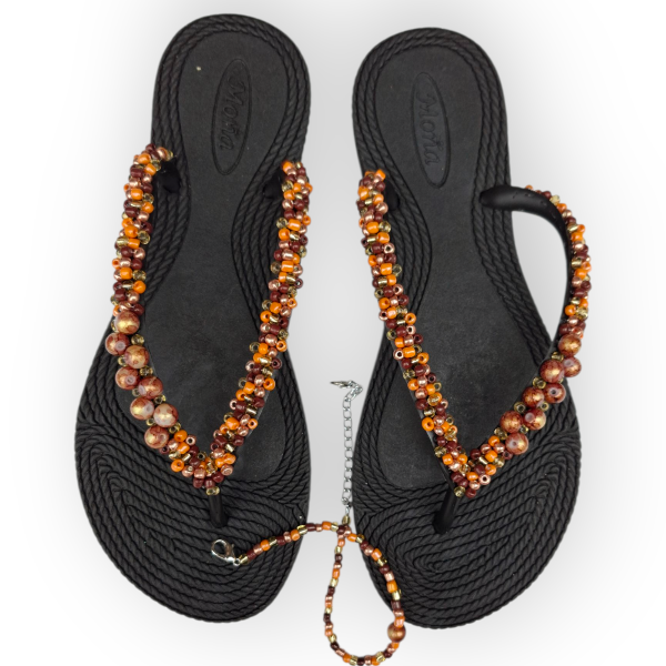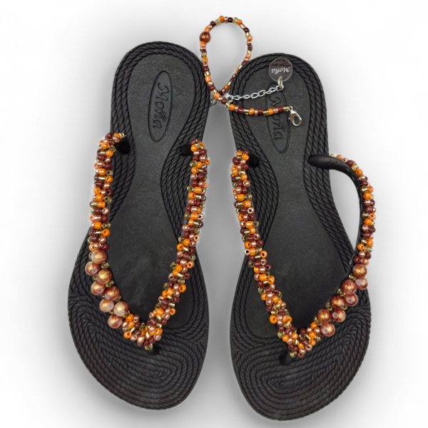Ojotas bordadas artesanalmente en mostacillas y pedrería. En ese caso, se combinan los colores naranja, marrón y dorados con detalles de perlas a tono. Incluye tobillera a tono, con cadena regulable. En la sección Información podés consultar la guía de talles, o solicitarla por WhatsApp