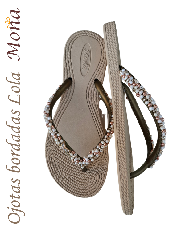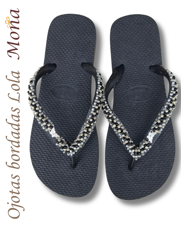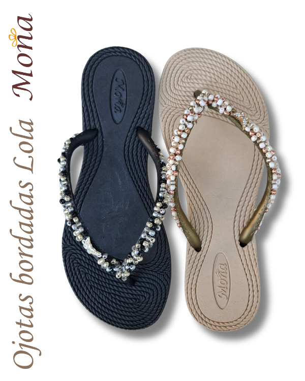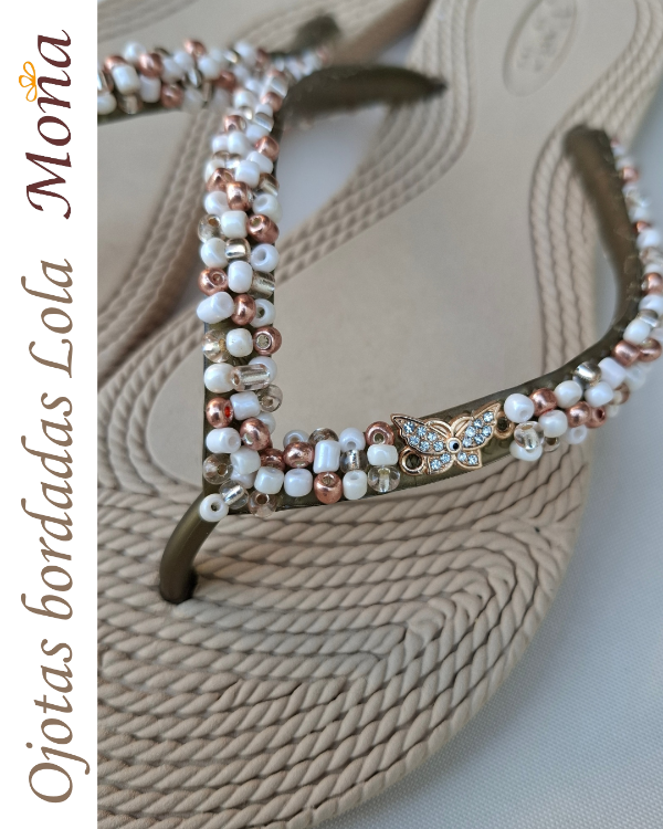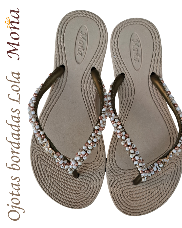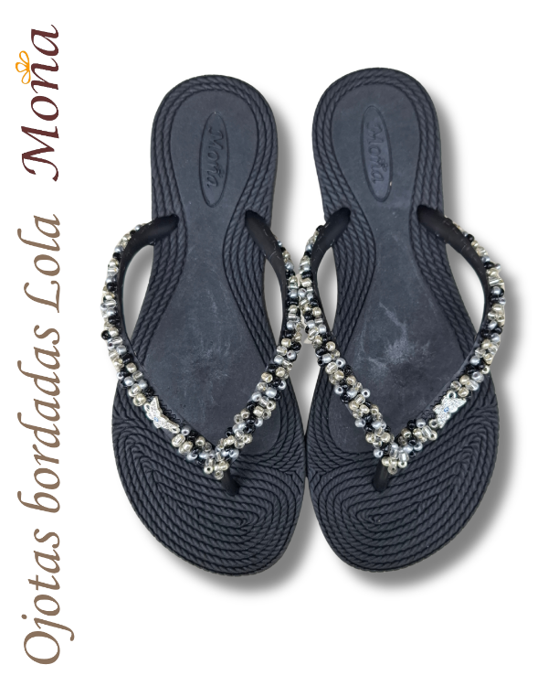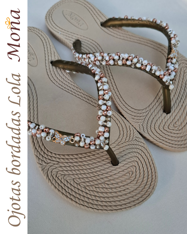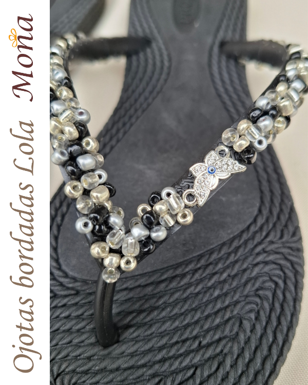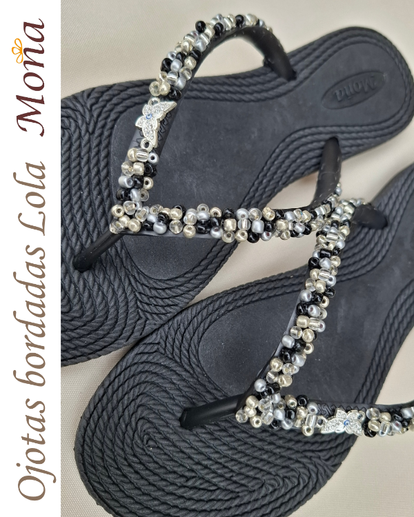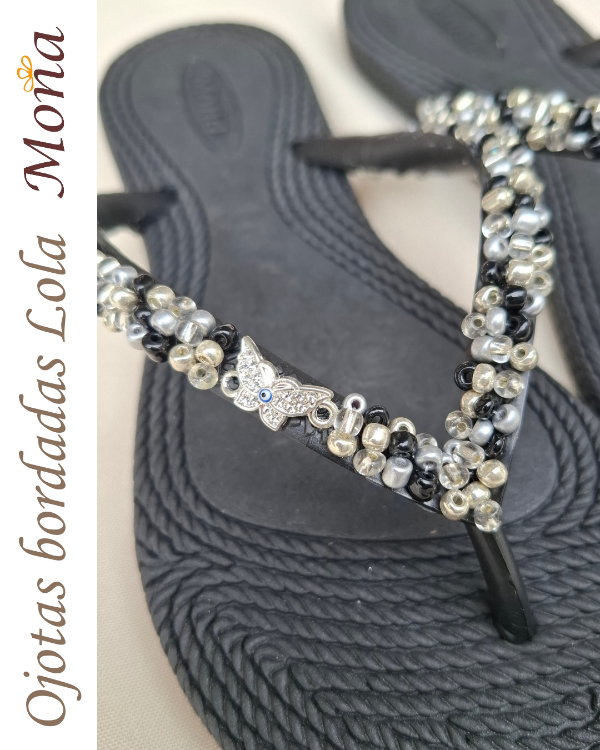 Ojotas bordadas artesanalmente en mostacillas y pedrería. En ese caso, se combina mostacillas con tonos negros y plata o naturales y dorados con un dije de mariposa de strass. En la sección Información podés consultar la guía de talles, o solicitarla por WhatsApp