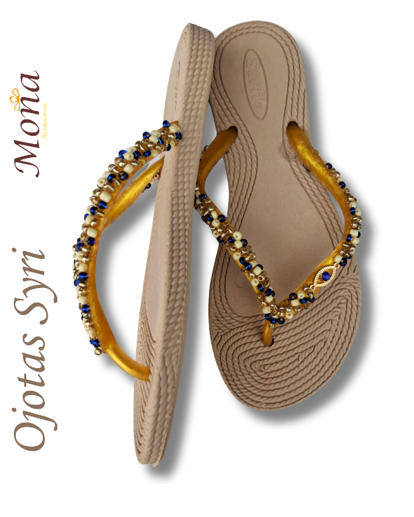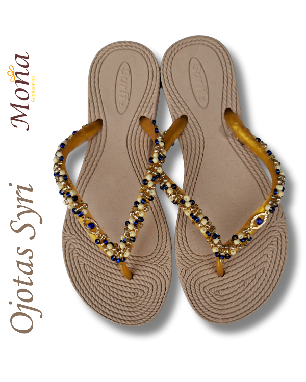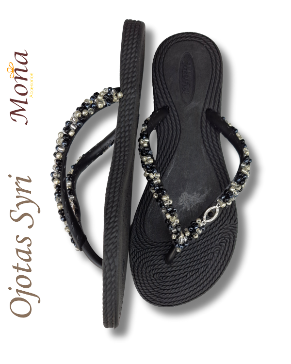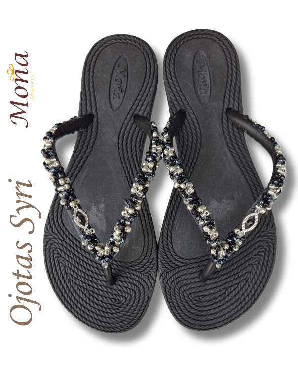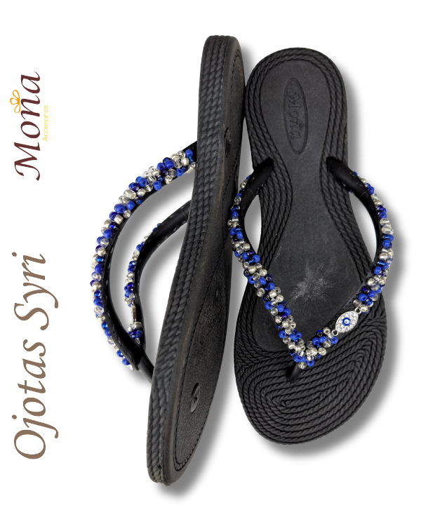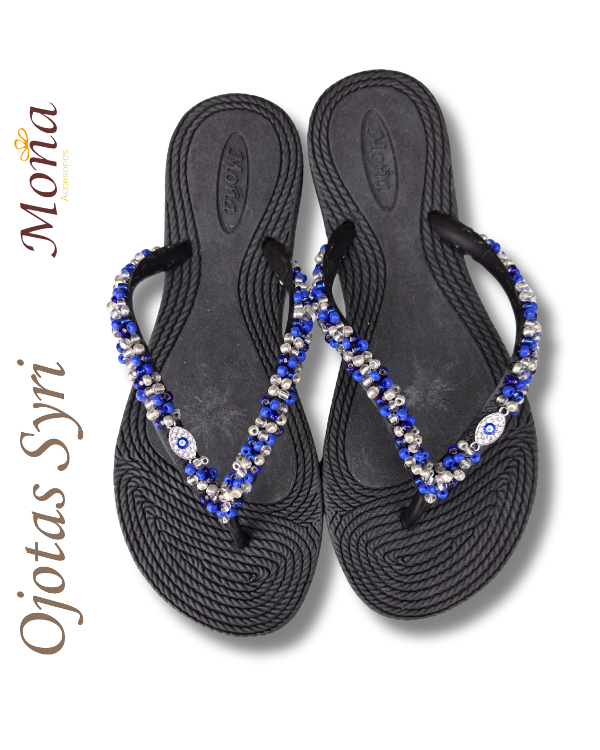 Ojotas bordadas artesanalmente en mostacillas y pedrería. En ese caso, podes elegir en base negra o arena, y bordados azul o negro, con detalle de dije a tono. En la sección Información podés consultar la guía de talles, o solicitarla por WhatsApp