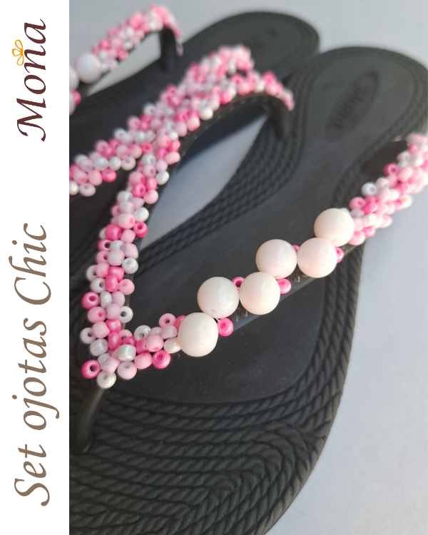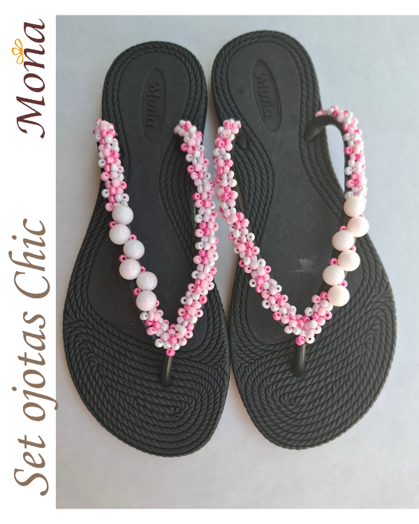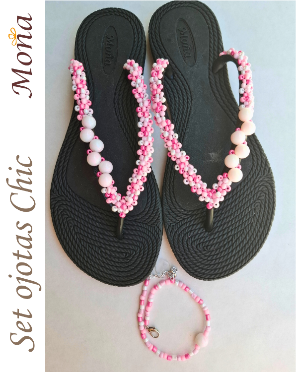 Ojotas bordadas artesanalmente en mostacillas y pedrería. En ese caso, se combina pedrería con mostacillas con tonos rosas.Opcional tobillera a tono, con cadena regulable. En la sección Información podés consultar la guía de talles, o solicitarla por WhatsApp